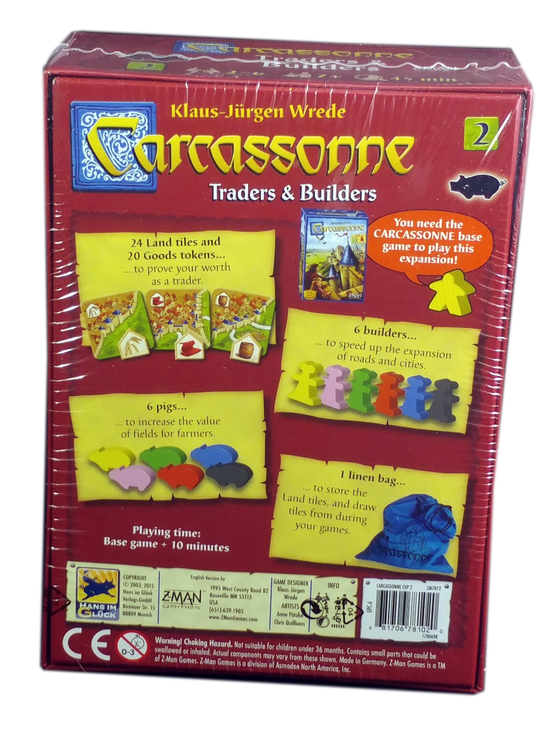 Traders & Builders expands on the popular Carcassonne base game, adding new features and opening even more ways to outwit your opponents. With the new builder follower, you can speed up construction by placing another tile immediately after you add a Land tile to a road or city that your builder occupies. Further, the pig followers and Goods tokens give you more ways to score points. The pig enhances the value of any farmers you have in the same field, while completing cities with Goods icons on them awards Goods tokens; the player with the most gains bonus points at the end of the game.