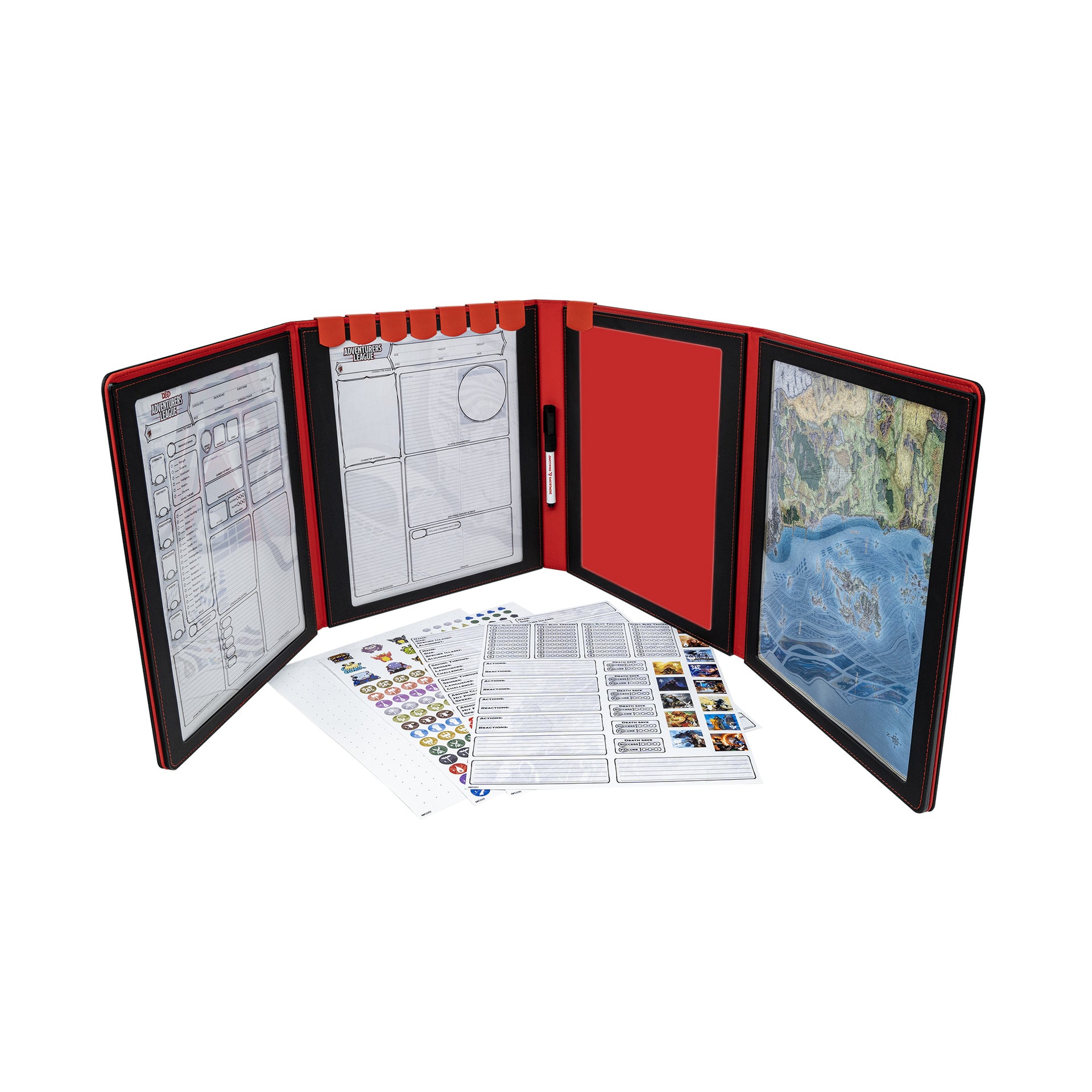 Each of the four clear, write-on pockets on the inside of the screen is gusseted and holds up to 10 8.5 x 11 sized paper sheets, which can also be held in place outside the pockets with the 8 included initiative tracker clips. Use the clear plastic sheet of each pocket as a wet/dry-erase surface for tracking map movements, initiative order, or shop inventory lists with the included dry-erase marker! This officially licensed screen features the classic D&D ampersand embossed and embroidered on the front cover, and sits perfectly flush on the shelf next to your other Ultra PRO Premium Source Book Covers.