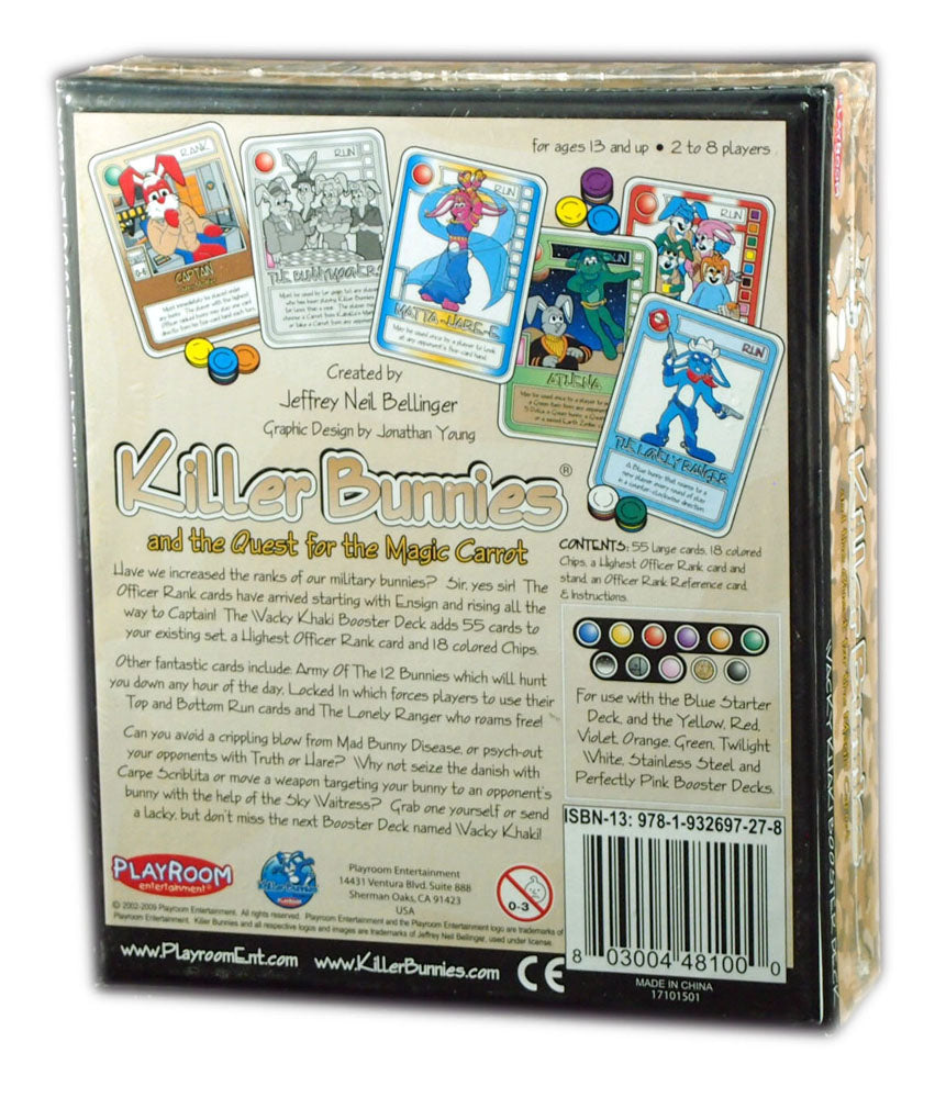 Have we increased the ranks of our military bunnies? Sir, yes sir! The Officer Rank cards have arrived starting with Ensign and rising all the way to Captain! The Wacky Khaki Booster Deck adds 55 cards to your existing set, a Highest Officer Rank card and 18 colored Chips.