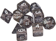 Glitter Black polyhedral dice set includes 4 x D6, 1 each of D4, D8, D10, D12, D20, and D10. Solid smooth hand feel with comfortable weight.