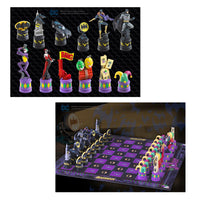 The 18.5" square chess board features a black and purple checker pattern, complete with alternating Bat-Symbols and Joker Symbols, suitable for the game of kings