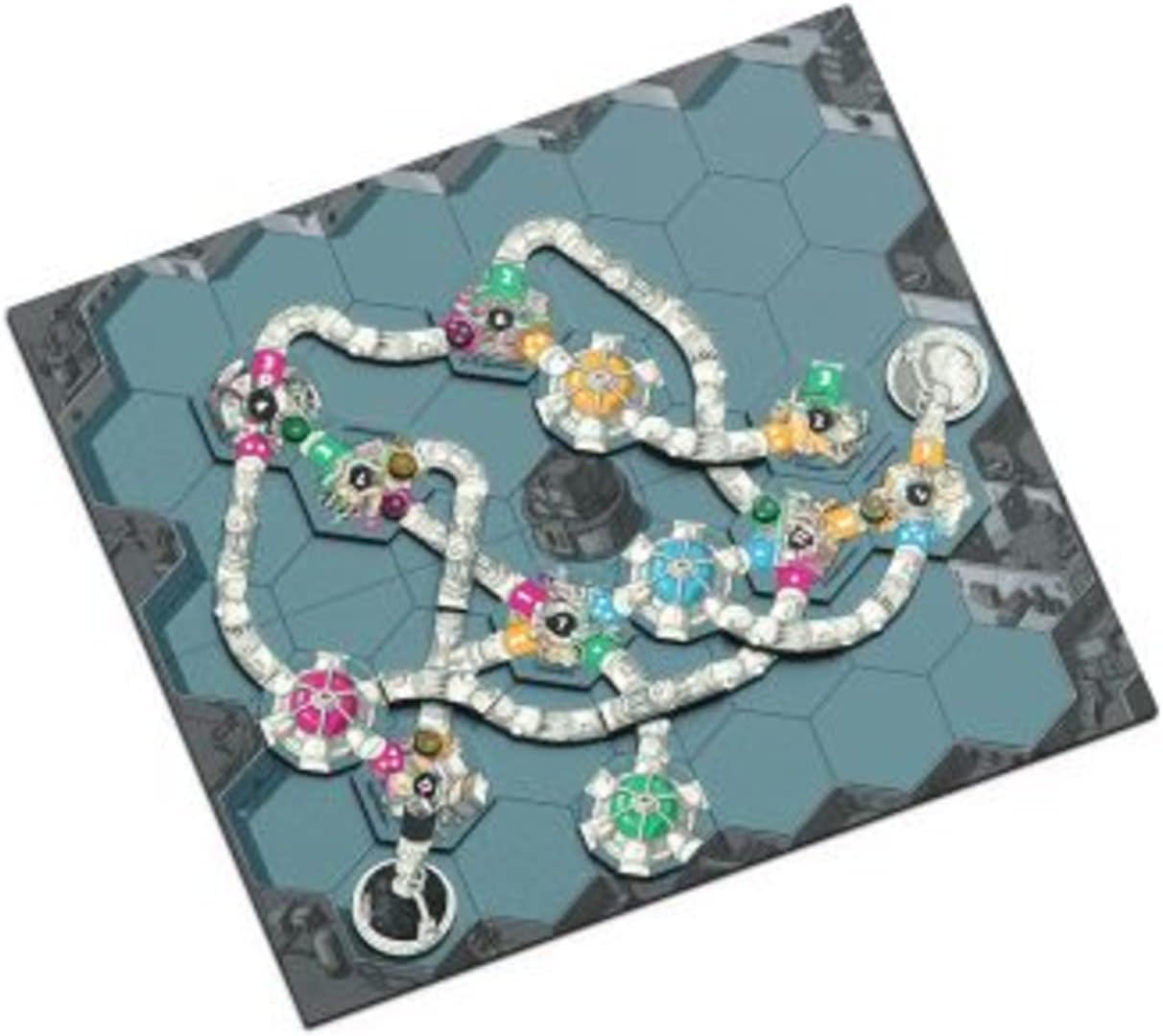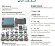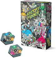 In Factory Funner, players are factory managers who select and install machines in their factory. They try connect all machine input and output pipes to the right reservoirs or to other machines in order to build the most profitable configuration. A new machine brings revenue. Other things you build (reservoirs and connectors (pipelines)) cost 1K money each. In each game round, players may select one machine (from a number of machines equal to the number of players) simultaneously, which means players try to quickly determine possible connections, then grab the tile they want. But by choosing too quickly, you risk taking a machine that doesn't fit well... When fitting in a machine, a key tactic is to keep the most and best options for connecting future machines! After eight rounds, the player with the most money wins.