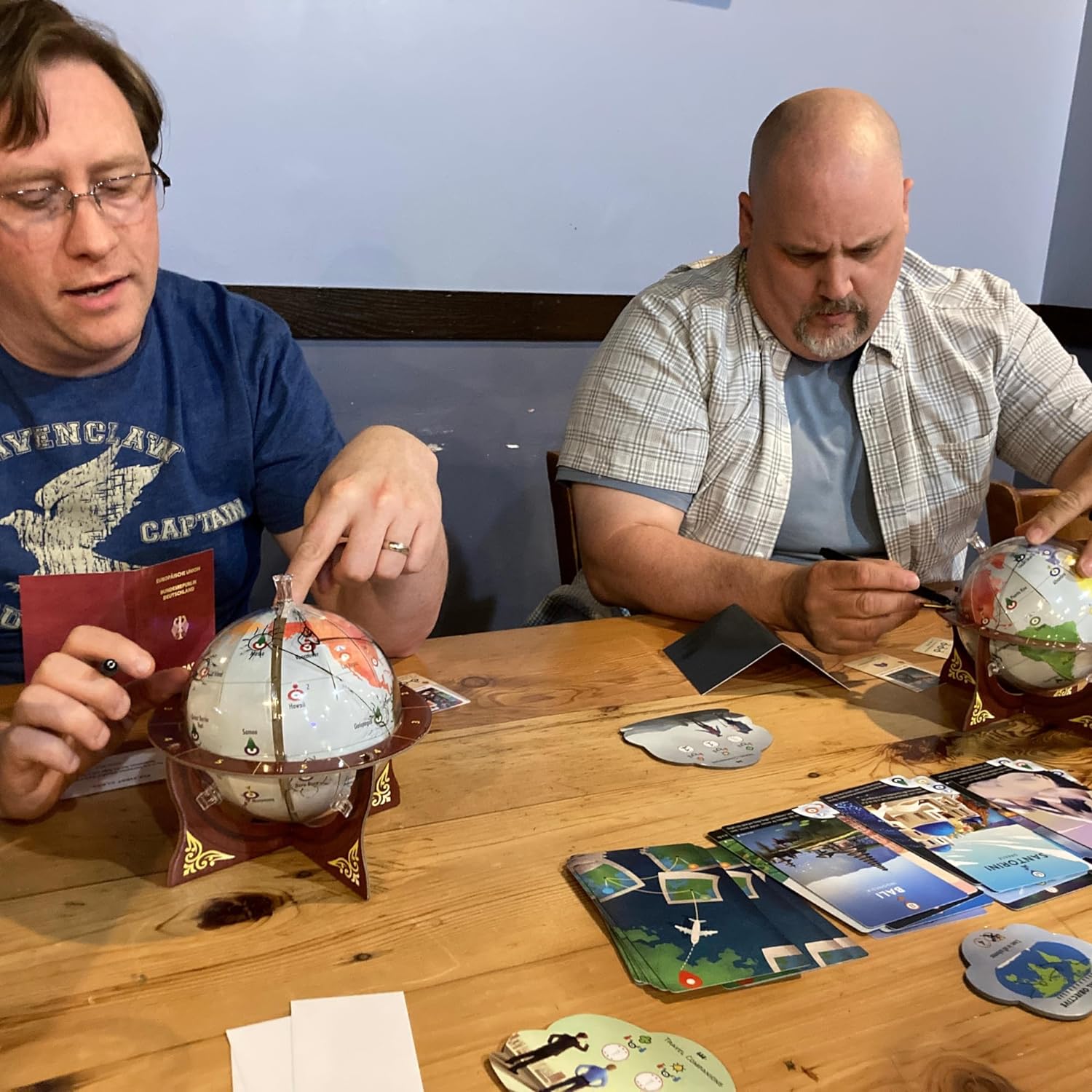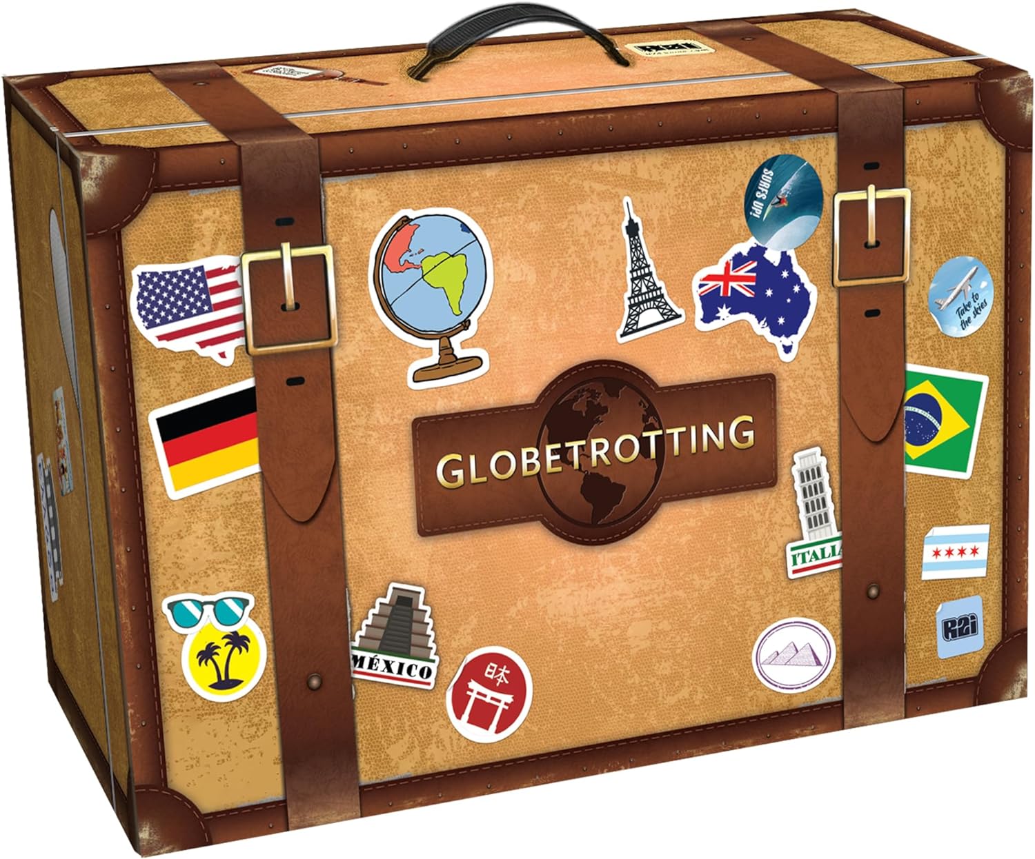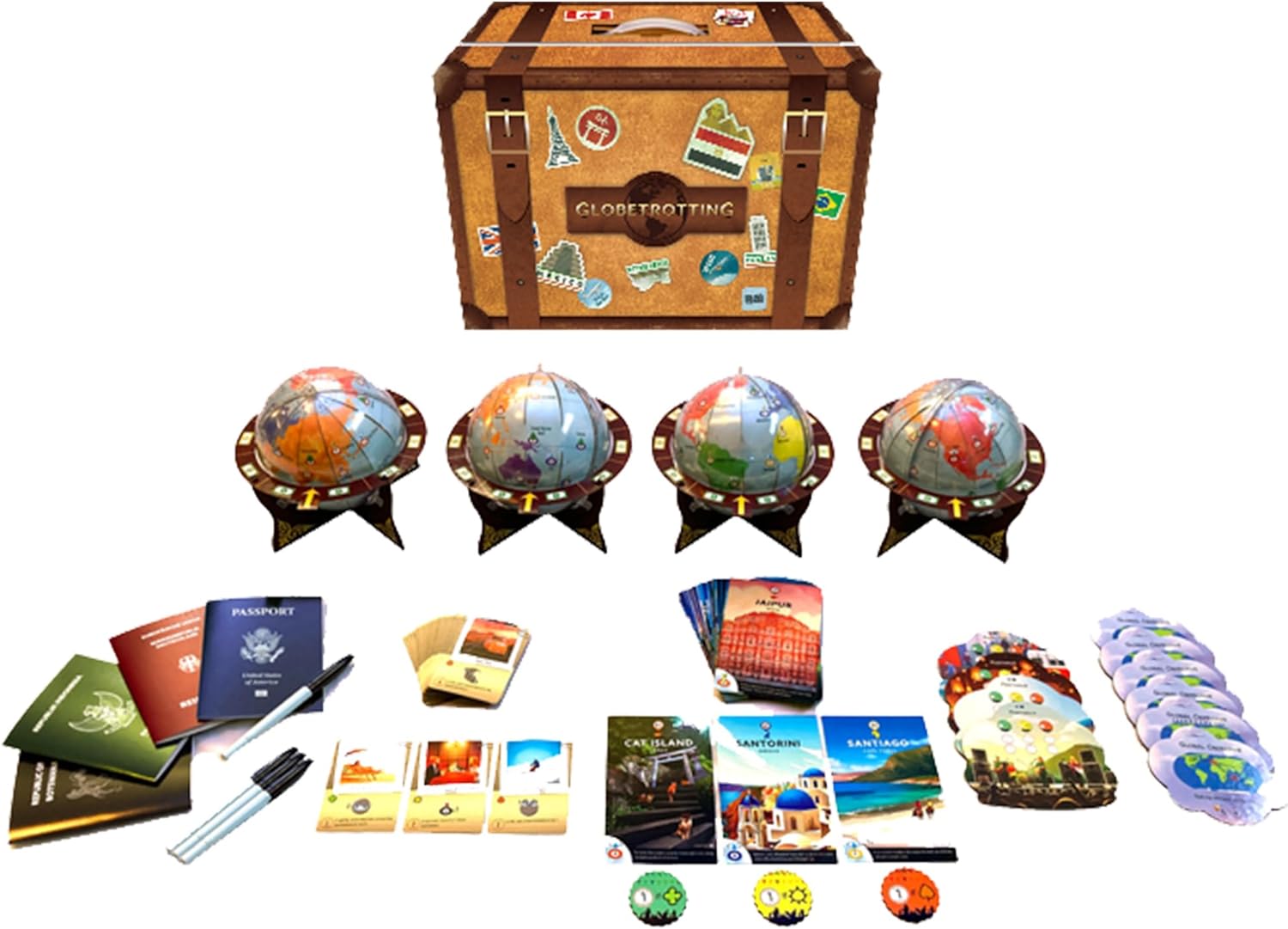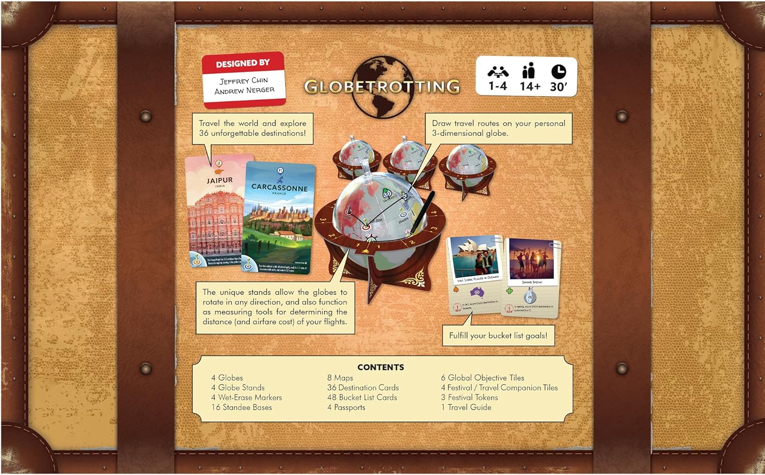 Globetrotting is a game about traveling the world. Players plot three epic trips to take over the next year. It’ll take careful planning to achieve all your travel goals while staying under budget. Each round, three Destination cards are revealed. Each player simultaneously selects one Destination and adds it to one of their three trips by drawing the travel route on their own globe. The globe stands have a built-in circular ruler to measure the distance (and cost) of each flight. The further you fly, the more expensive the trip. Players score by accomplishing the objectives on their Bucket List cards. In addition, each player has shared Travel Buddy Goals with each neighboring player. Coordinate plans with your travel buddies to meet up in the same place at the same time to score. And everyone is racing to be the first to complete the Global Objectives. The player who checks off the most travel goals wins! .