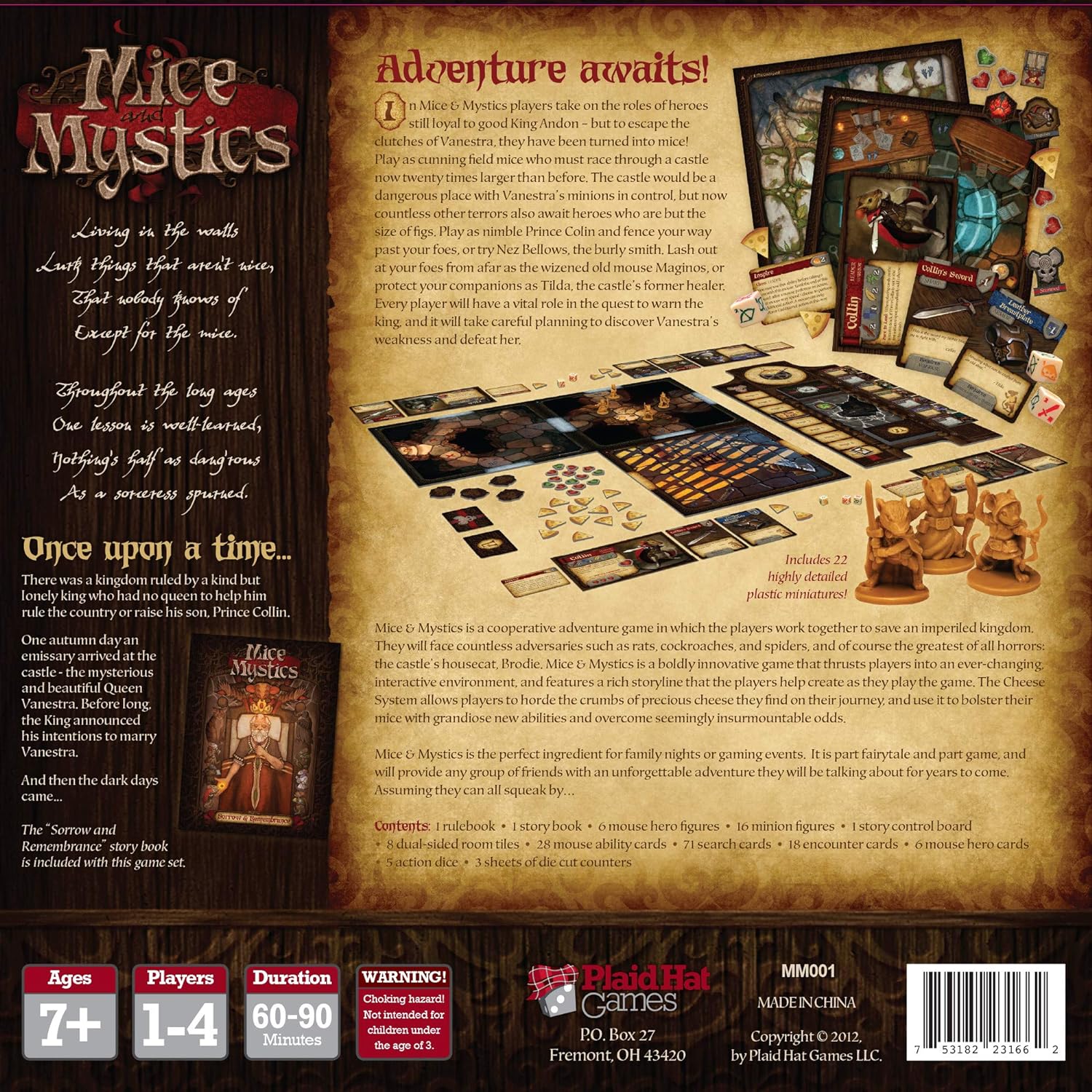 Mice & Mystics is a cooperative adventure game in which the players work together to save an imperiled kingdom. They will face countless adversaries such as rats, cockroaches, and spiders, and of course the greatest of all horrors: the castle's housecat, Brodie. In Mice and Mystics, players page through the chapters of a Mice and Mystics storybook, taking on the roles of mouse adventurers as their story unfolds.This box set is stuffed with everything you need to go on the first adventure with Prince Collin and his allies.