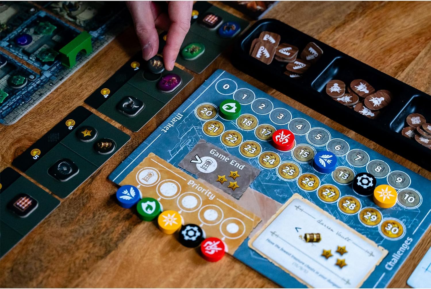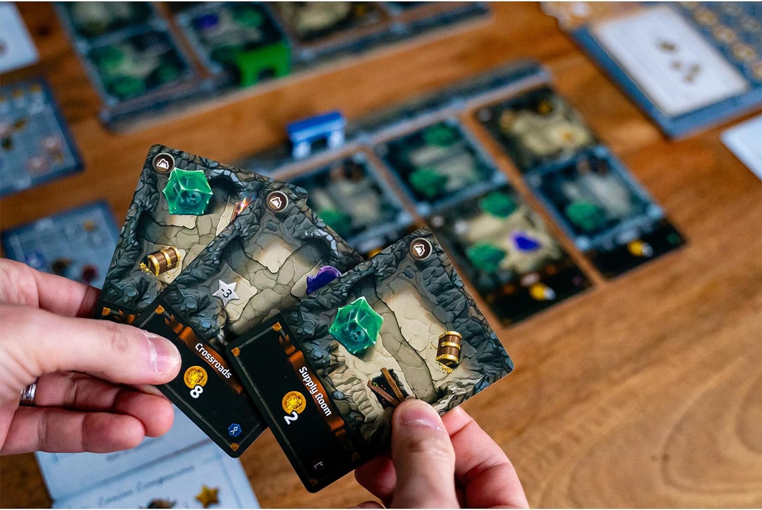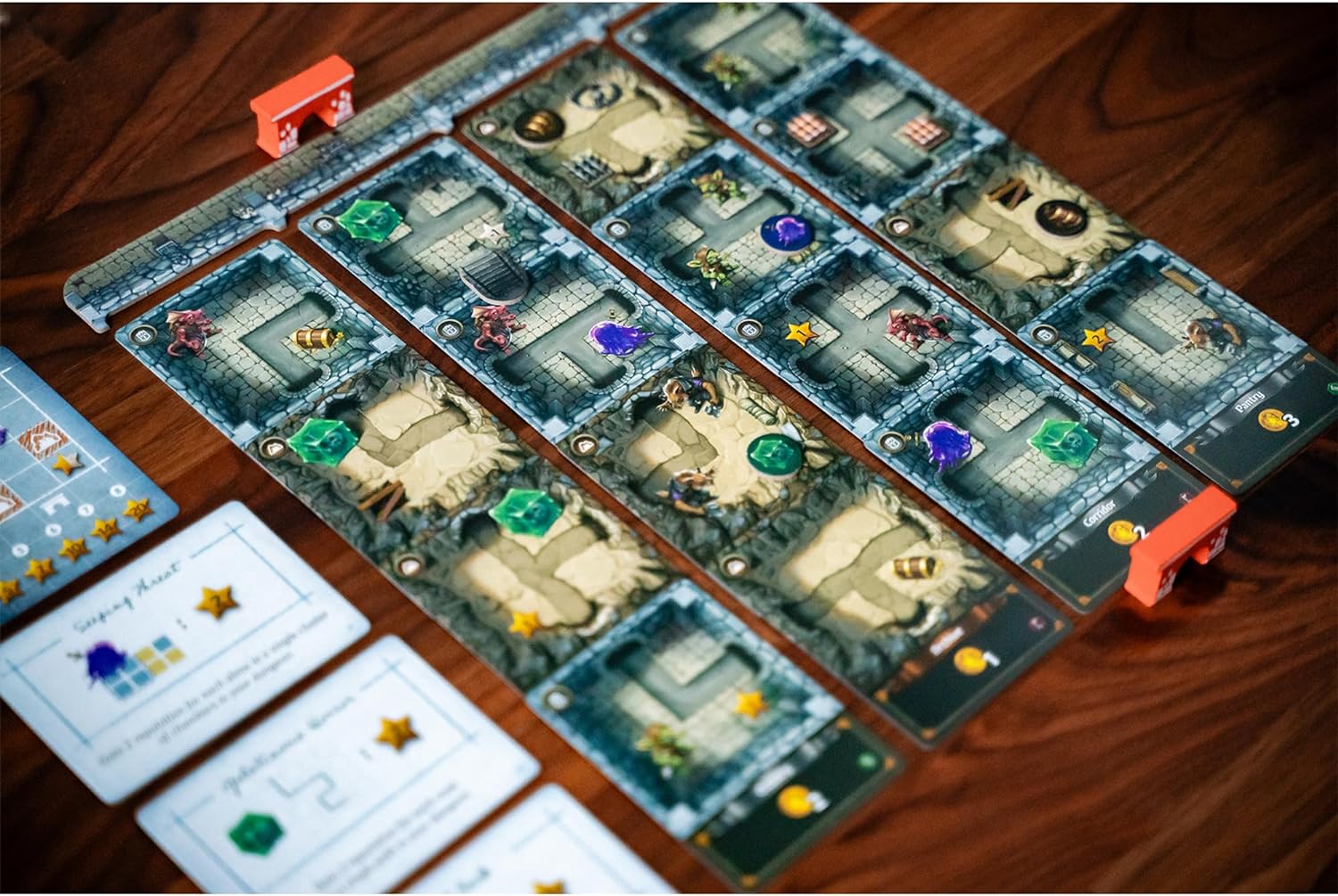 HOW TO PLAY - In this fun and easy to learn strategy game, players simultaneously draft cards, placing them to expand their own dungeons one chamber at a time over four swift rounds. Follow a unique blueprint and a variety of scoring challenges, using the paths on the cards to connect as many chambers to the entrance and exit as you can! Spend your gold wisely between rounds to customize your labyrinth with monsters, traps, treasures, and even sneaky secret passages. Or, drop out of the market early to snag the perfect new scoring challenge to suit your design. At the end of four years, the player with the most treacherous dungeon will earn the title of Master Architect!