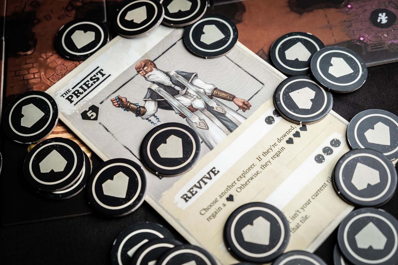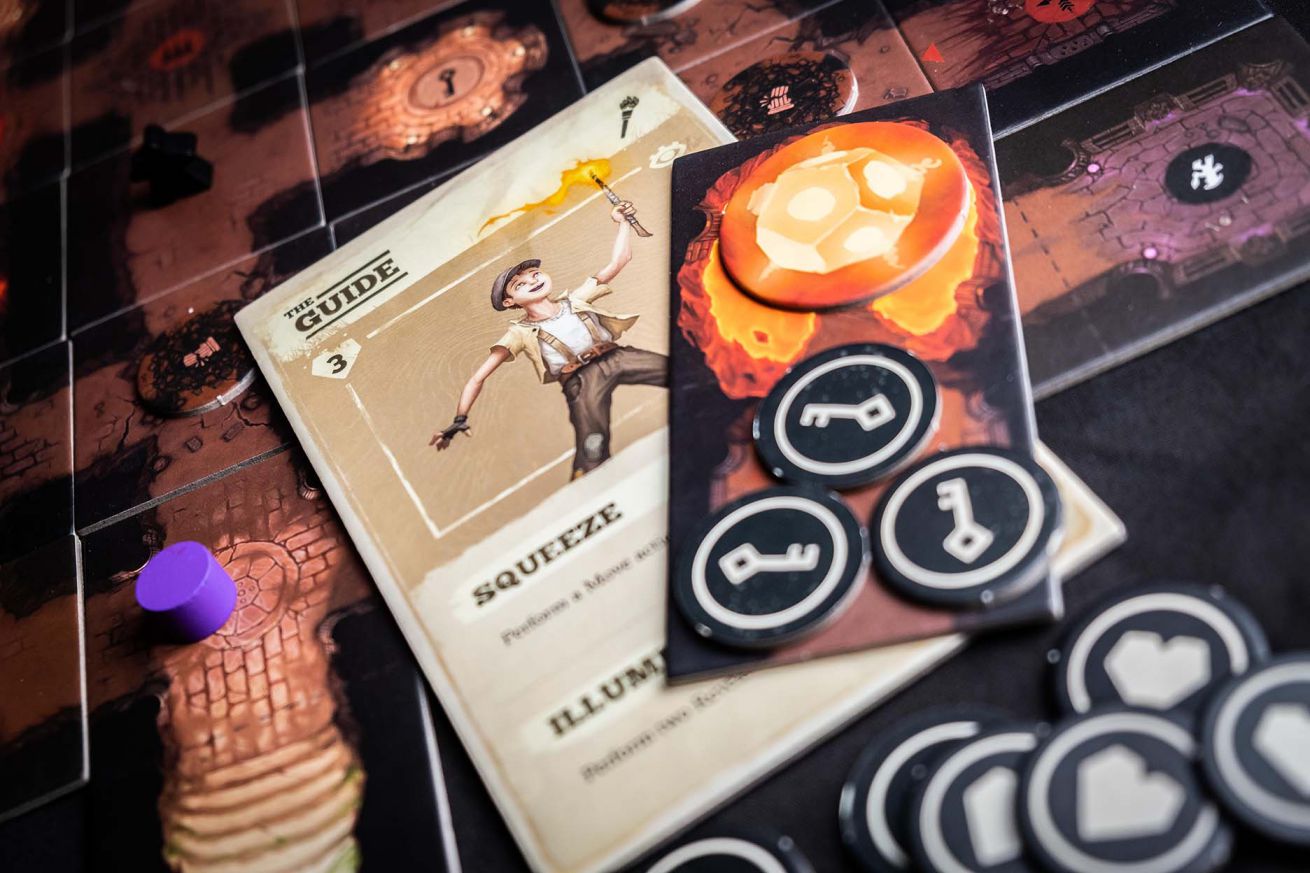 Players must collectively locate and obtain 3 'keys', mysterious objects that are needed to gain entry to the chamber containing the legendary artifact. Your adventures must be quick, though, as the volcano stirs and as the game progresses you get closer to the volcano erupting, flipping tiles to completely inhospitable lava flows that will chase the adventurers from the cave.