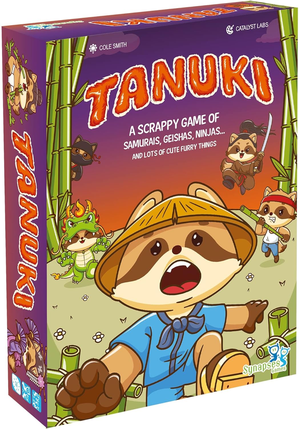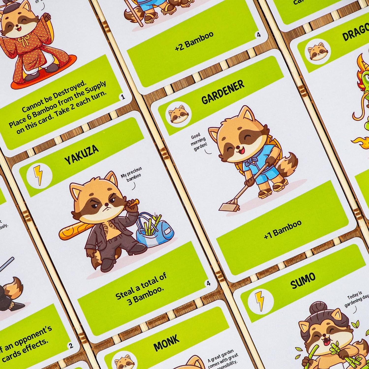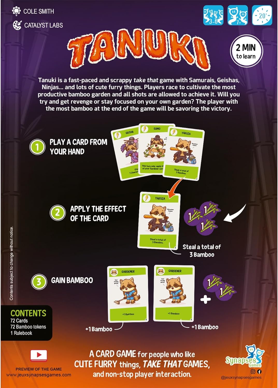 Welcome to the vibrant world of Tanuki, where Gardeners, Geishas, Ninjas and tons of cute furry creatures clash in a race to cultivate the most productive bamboo garden. Will you try and get revenge or stay focused on your own garden? If you are looking for cute designs, fierce battles and strategic decision-making, then Tanuki is the game for you. Do you have what it takes to win in this no holds barred take that game? It’s time to unleash your inner furry warrior! Tanuki is a fast-paced card game where players play Action or Character cards, apply the cards’ effects and harvest bamboo from their gardens. Each Character card in the garden has its own unique abilities.
