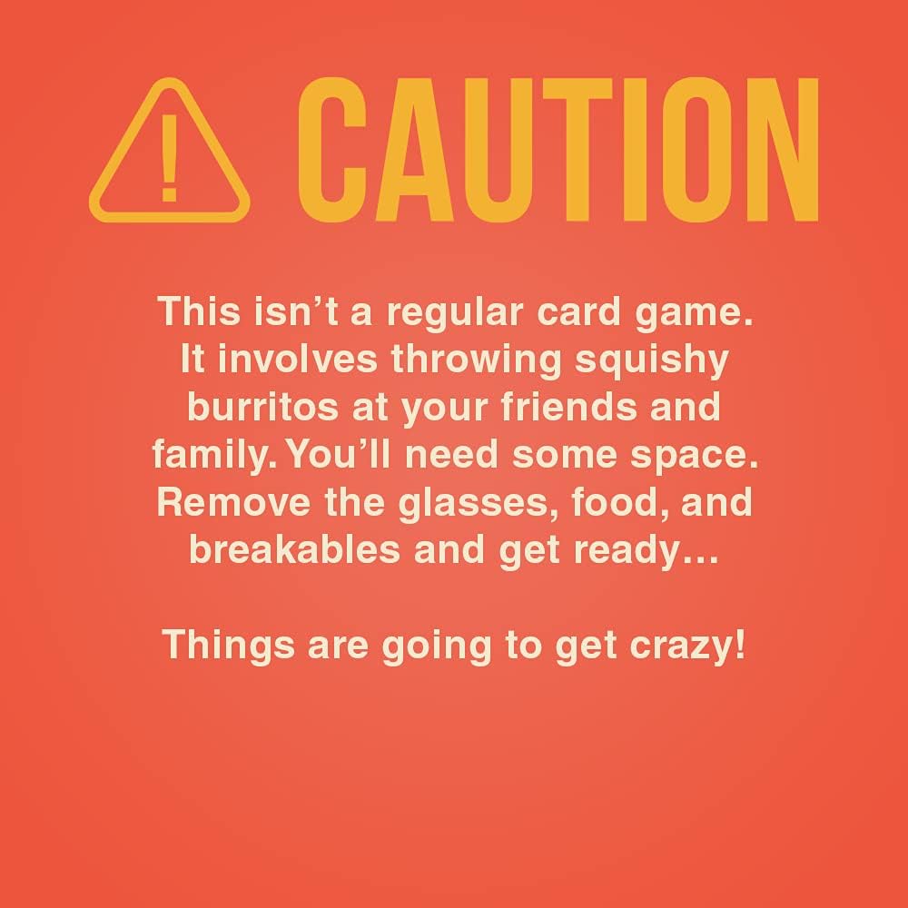 Throw throw Burrito is what you get when you cross a card game with dodgeball. Try to collect matching sets of cards faster than your opponents while simultaneously ducking, dodging, and throwing squishy airborne burritos. The cards you collect earn points, but getting hit by flying burritos loses them. So clear some space and put away the antiques, because you've never played a card game quite like this before. How it works: place a pair of burritos on a table and draw cards. Keep your cards a secret. Rack up points by finding sets of three in the deck. Find matches before anyone else does. If someone plays Burrito cards, a battle ensues.
