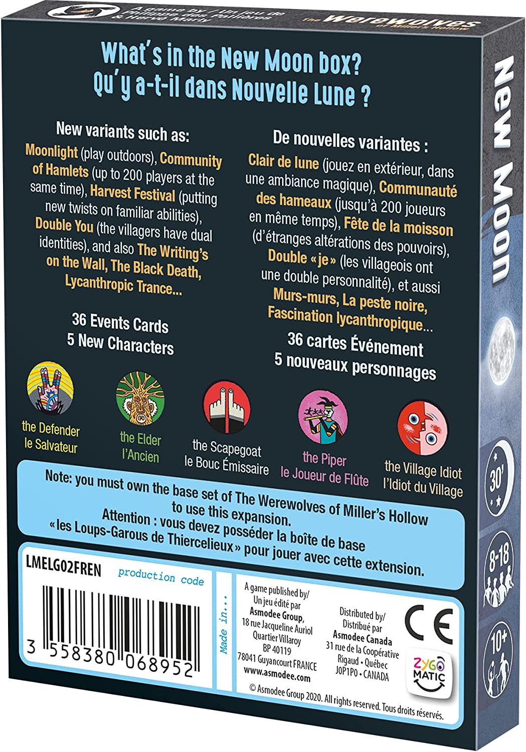 The return of the werewolves! Create even more suspense with new game variants, game elements, and characters. This expansion also introduces event cards that, every night, will change the game entirely. For even more enjoyment, nine game variants are included to renew your gaming experience.