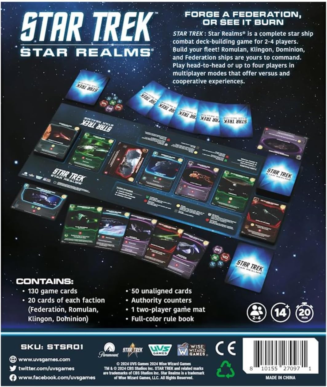 UVS Games is proud to bring this marriage of Star Realms, an award winning deck-building game originally released by Wise Wizards in 2014, and Star Trek, the sci fi series known and loved the world over, together in this new game! Featuring deep strategic play, Star Trek Star Realms is easy to learn yet hard to master.
