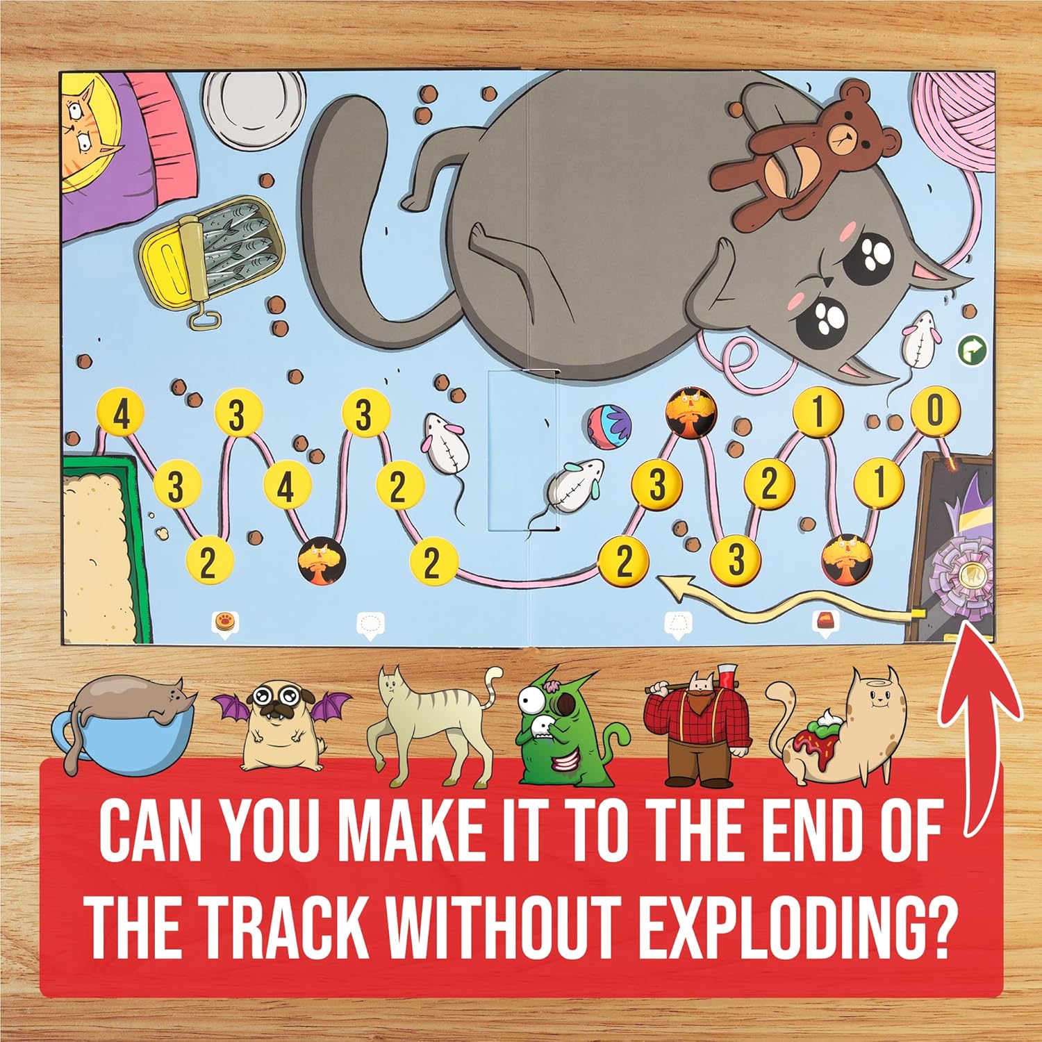 Starts simple: First to the finish wins, while trying to avoid the Exploding Kittens spaces.