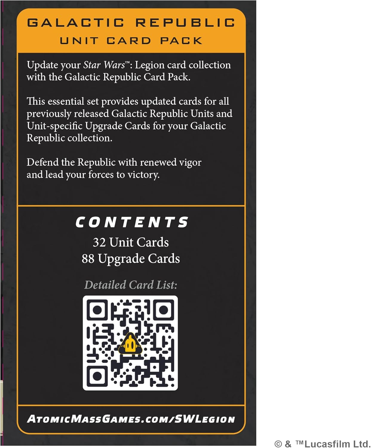 This essential set provide supdated cards for all previously released Galactic Republic Units, Unit specific Upgrade Cards, and Command Cards for your Galactic Republic collection.