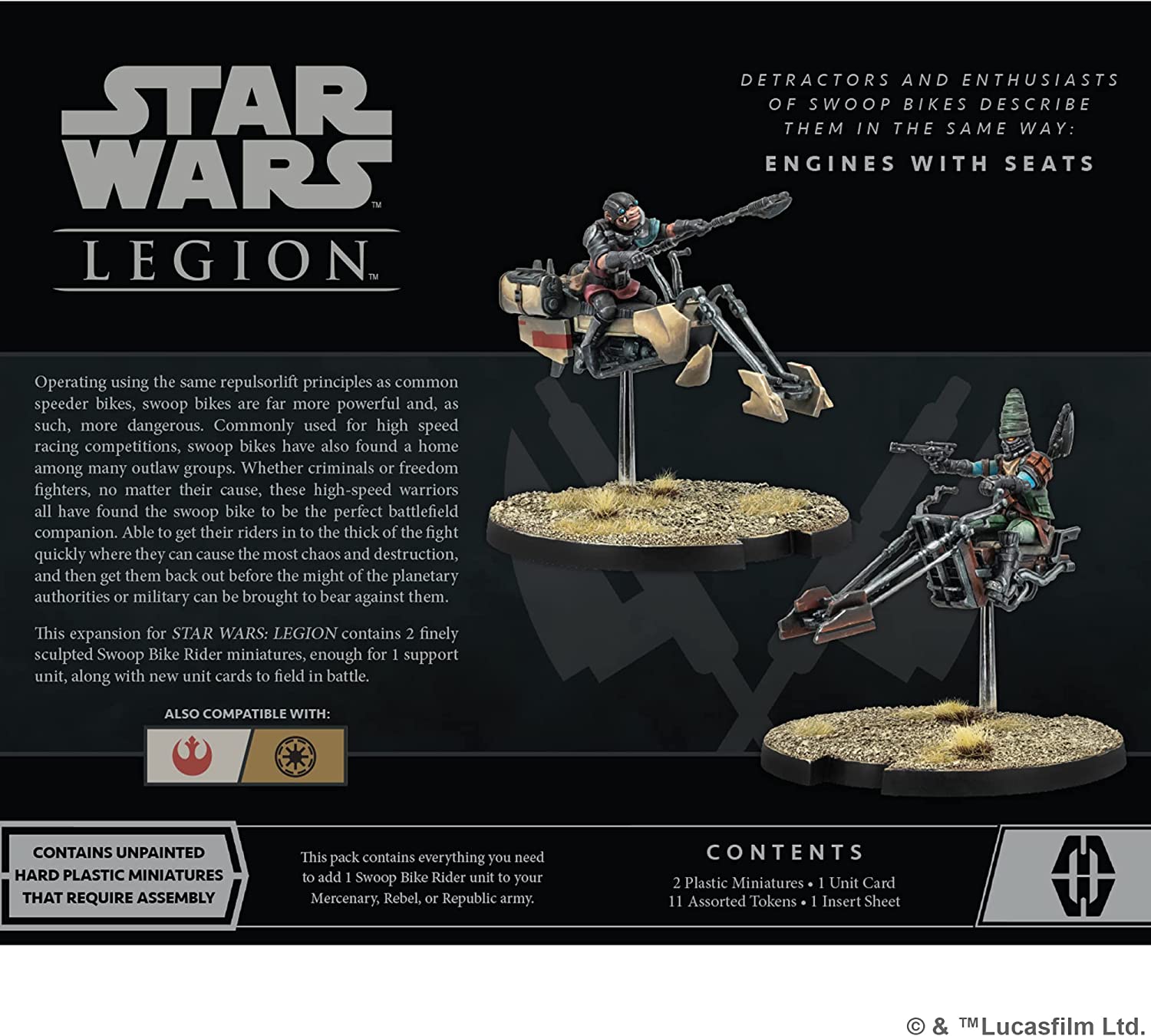 Players speed into the battles of Star Wars: Legion with the Swoop Bike Riders Unit Expansion! Whether criminals or freedom fighters, many groups across the galaxy see swoop bikes as the perfect battlefield companions that make their forces even more mobile. The support unit of two Swoop Bike Riders found in this expansion helps players get their forces into the thick of the fight quickly where they can cause the most chaos and destruction before zooming out before the might of planetary authorities can be brought against them. Able to be fielded by either the Rebel Alliance or gangs of mercenaries, these riders add a fast and furious new element to any army.