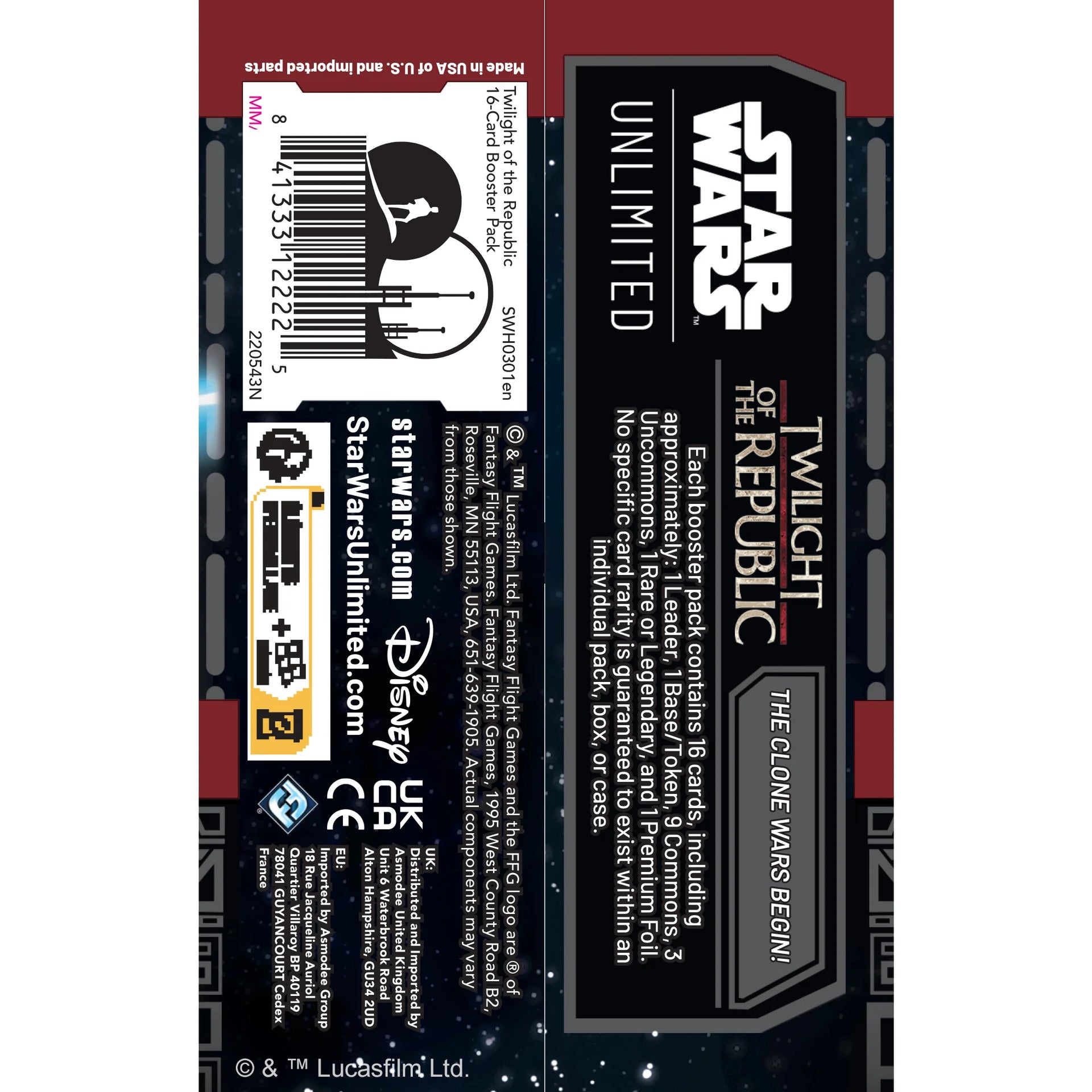 Inside this booster pack display, you'll uncover 24 individually wrapped booster packs, each containing 9 common cards, 3 uncommon cards, 1 rare or legendary card, 1 leader, 1 base/token, and 1 captivating foil card. The Twilight of the Republic set explores the military conflicts between the Galactic Republic and the Confederacy of Independent Systems, offering a rich and thrilling experience from the Clone Wars era.