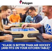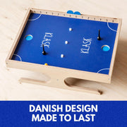 Forget table football and table hockey and make way for Klask: the new trendy game combining skill, tactics and speed! The game board is shaped like a ball field with two holes functioning as goals in each end of the field. Your gaming piece is a black magnet. Shoot the ball past the obstacles and your opponent and into the goal hole: Klask!