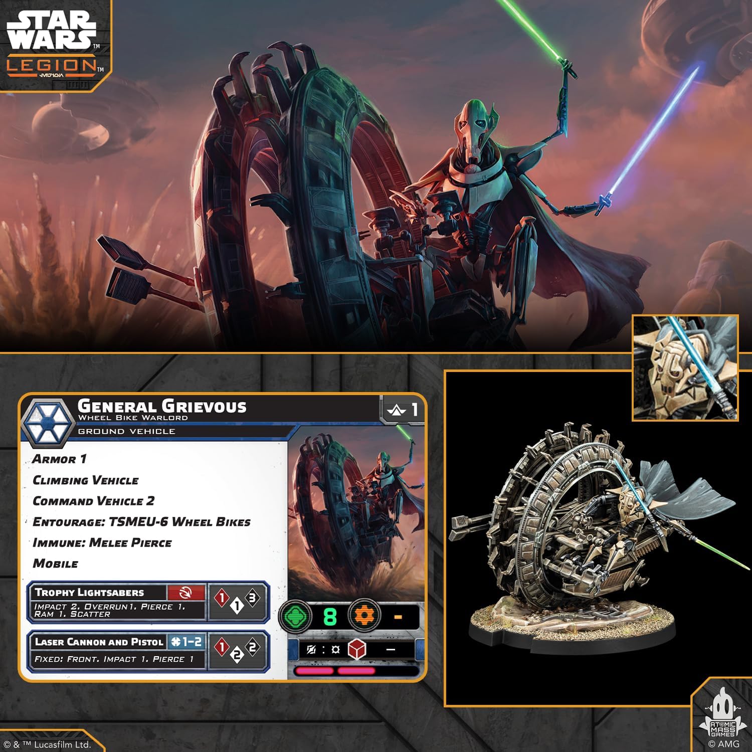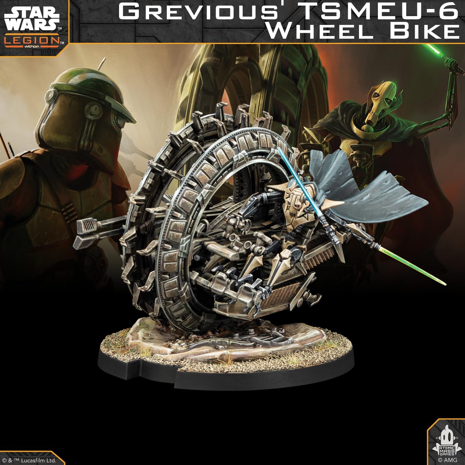 Le rang du général Grievous ne l’a jamais tenu à l’écart du champ de bataille. Vraiment, Grievous est peut-être même trop impatient d’être derrière les commandes d’un véhicule qu’il peut utiliser pour traverser le champ de bataille. Cependant, aucun véhicule n’est mieux adapté à ses tactiques féroces que le TSMEU-6 Wheel Bike. Robuste et agile, le vélo à roues permet à Grievous de se frayer un chemin à travers ses ennemis.