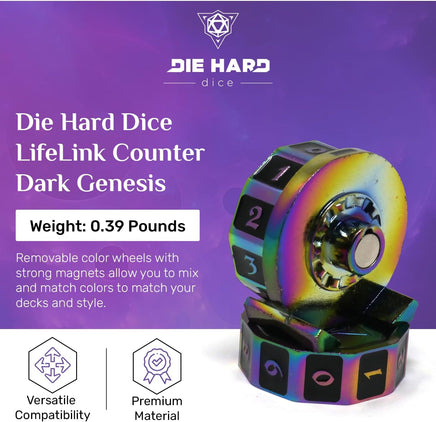 Take command of the table with LifeLink Counter! Forged from metal, this hefty life counter is ideal for your favorite card game from the wizarding coast! Thematic colors are available to match your decks with blue, green, red, white, and black! Need more than one color? Die Hard Dice has you covered! The LifeLink Counters are REMIXABLE! Bound together with a strong magnet, you can mix and match your life counters to make a counter with two different colors.