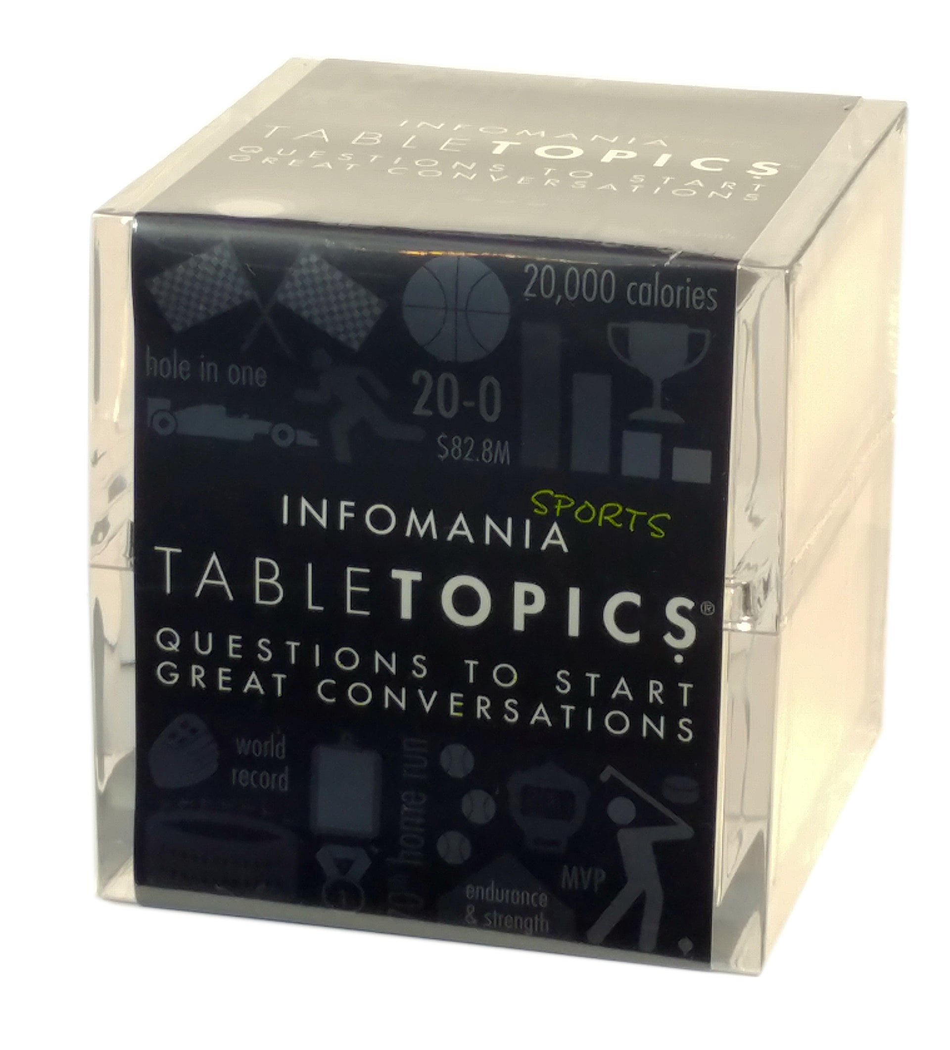 Amazing Statistics & TableTopics questions for conversations guys will love Something for every sports fan! This conversation starter set is packed with enough amazing statistics to please any sports fanatic along with cool INFO-graphics and great questions to engage even the casual sports enthusiast. Talk sports, share stats and a whole lot more. It's information meets cool graphics meets great questions. Sports fans will absolutely love it!